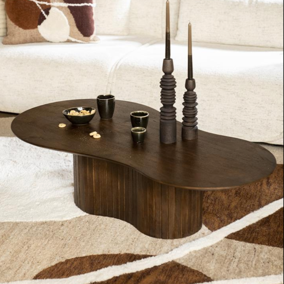 Deze unieke salontafel, vervaardigd uit hoogwaardig mangohout, straalt warmte en natuurlijke schoonheid uit. De bruine kleur en de druppelvormige ontwerp maken het een echte eyecatcher in elk interieur. Perfect voor wie houdt van een natuurlijke look en een product van uitstekende kwaliteit zoekt voor dagelijks gebruik. Materiaal: donker bruin mango...