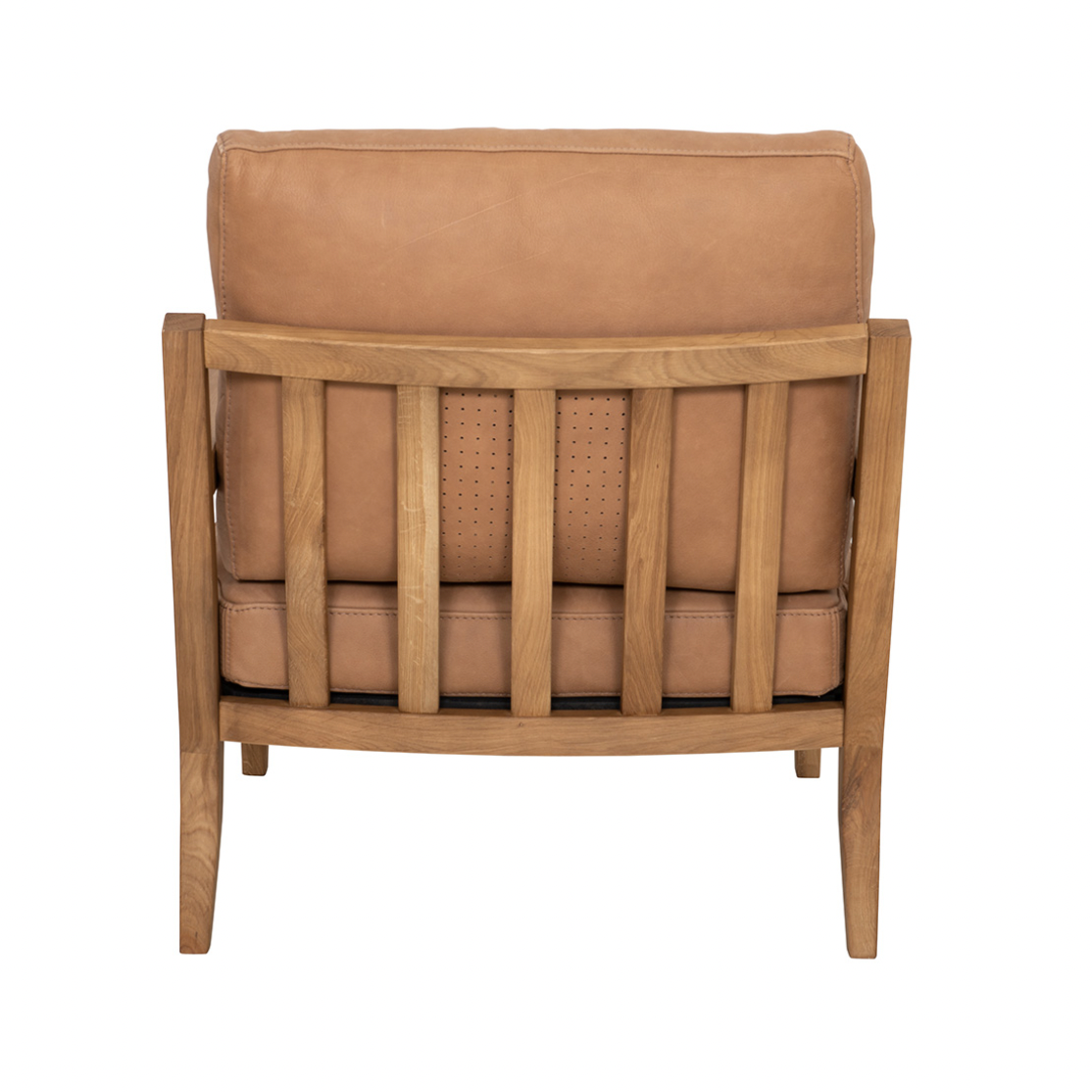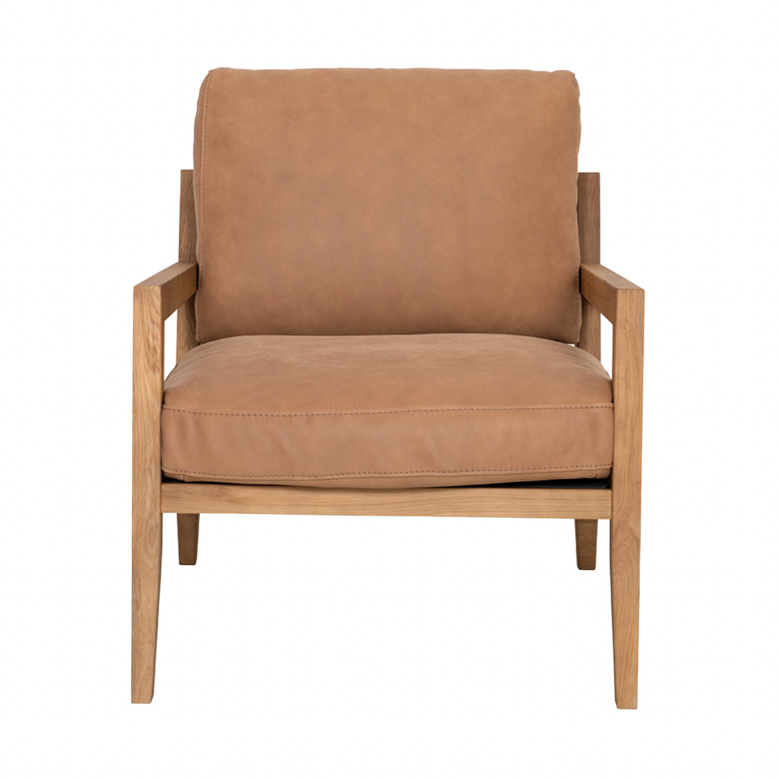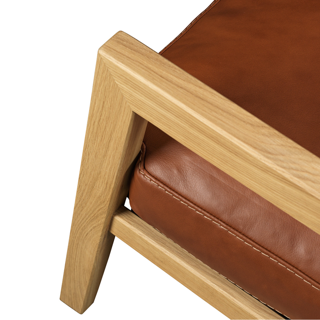 Deze fauteuil heeft een massief eiken frame, dat mooi gecomplimenteerd wordt door de toevoeging van een gecapitonneerd aniline lederen kussen en een rugleuning van hand gevlochten koord. Materiaal: licht geolied eiken. Zitting van geperst fineer bekleed met soepel aniline leer. Geweven naturel koord bij de rugleuning . Afmetingen: breedte: 74...