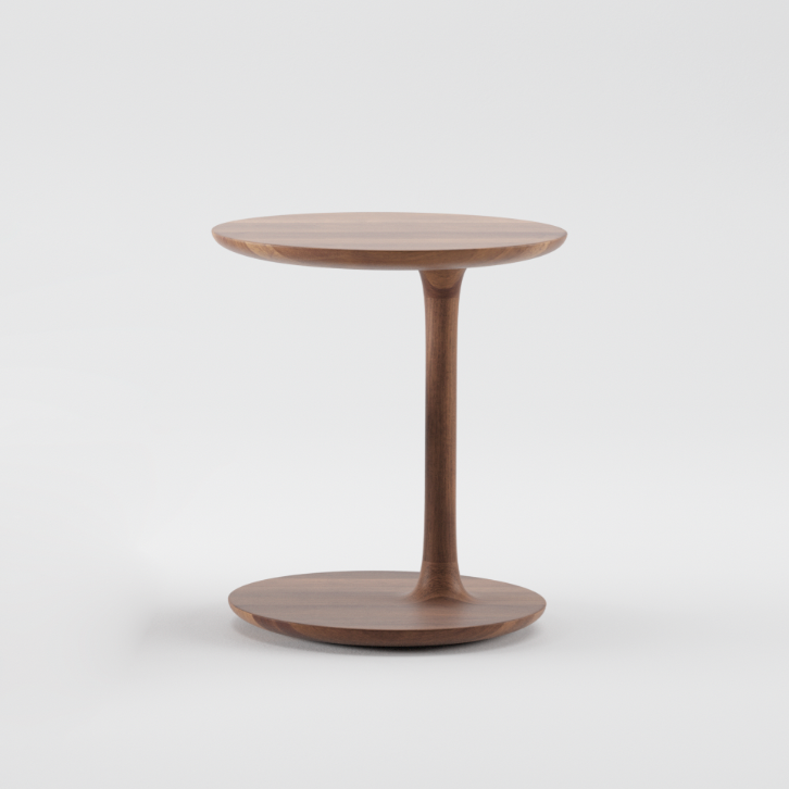 Het bijzondere ontwerp laat het tafelblad lijken te zweven door een verschoven rotatieas van onderstel, poot en blad. De ronde, ranke vormen geven de tafel een verfijnd en zacht karakter. Materiaal: walnoot Afmetingen: Ø40 - h: 45 cm Leverbaar: 12 weken