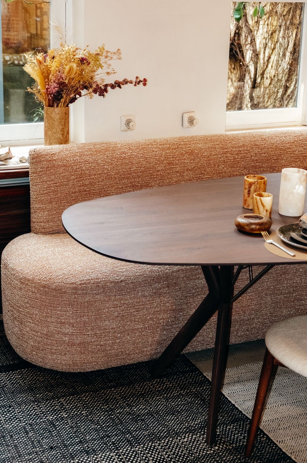 Het topaz bankje heeft organische vormen en zachte rondingen, wat een gevoel van rust oproept. De kleurencombi's zijn neutraal en passen daardoor goed in meerdere woonstijlen. Zet de eetkamerbank tegen een wand met wat kussens erop, zodat je helemaal comfy kunt aanschuiven aan tafel. Ook in je hal misstaat dit...