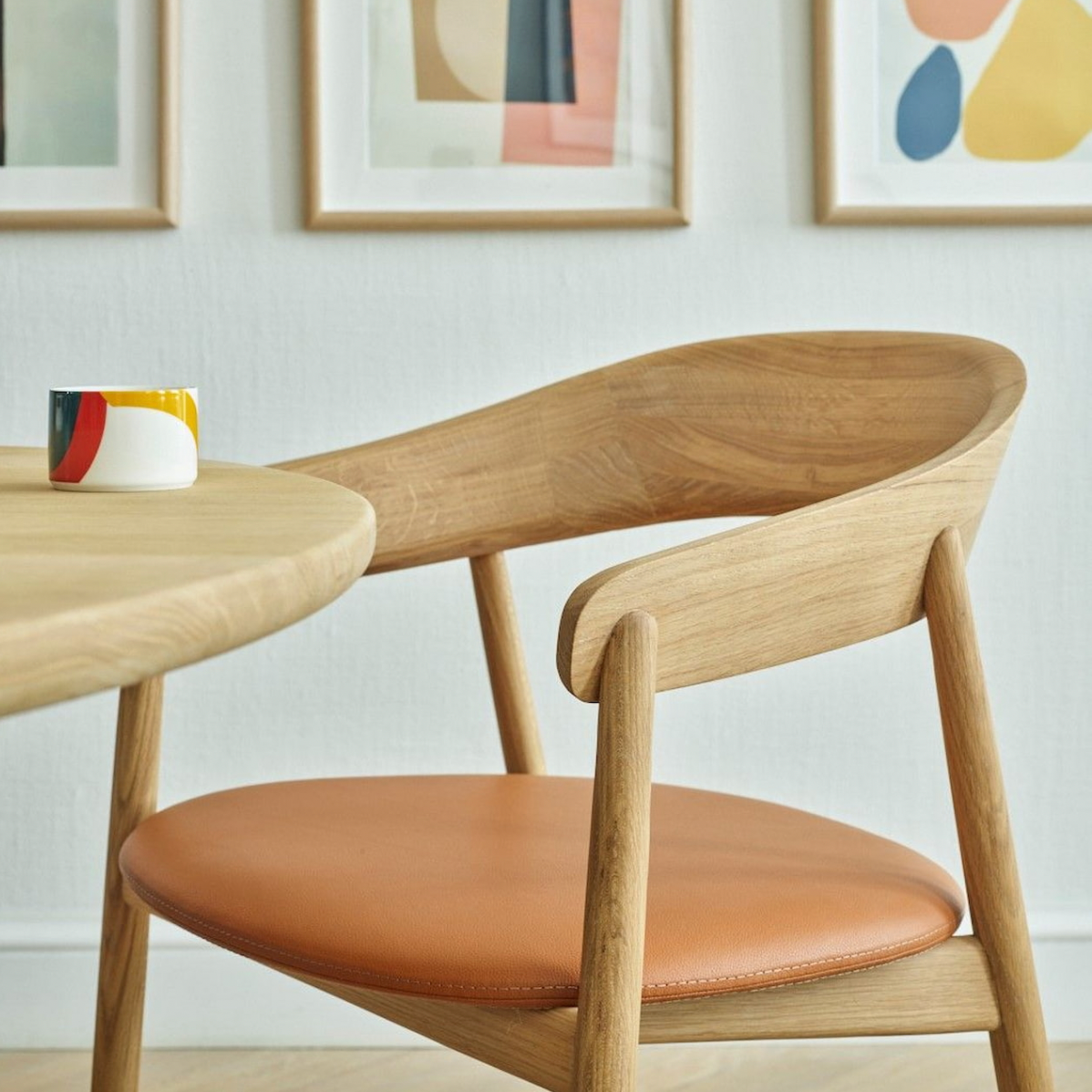 De Cabin stoel is geschikt voor de eet- of woonkamer. Deze stoel heeft afgeronde onderdelen van massief eikenhout en een zwevende fineerzitting met een vast kussen in zandkleurig leer. Het leer heeft unieke visuele kenmerken. Afmetingen: hoogte: 77 cm - breedte: 48,5 cm - diepte: 47 cm Materiaal bekleding: Camel leder...