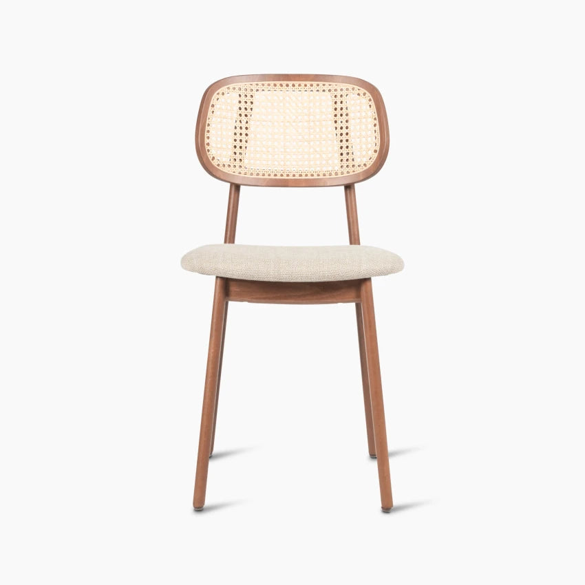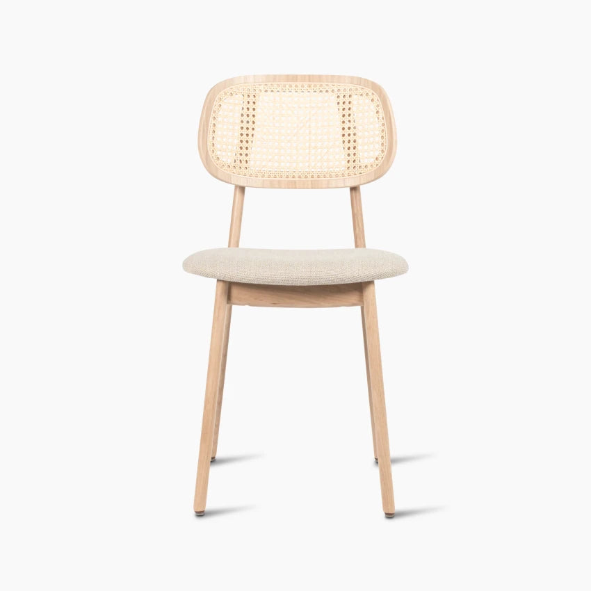 Een verfijnde eetkamerstoel met prachtig geweven canage, een beuken frame en zacht zitje. De Titus stoel voegt een design statement toe aan ieder interieur. Afmetingen: hoogte: 84 cm - breedte: 44 cm - diepte: 51 cm Materiaal : stof / Beuk / canage