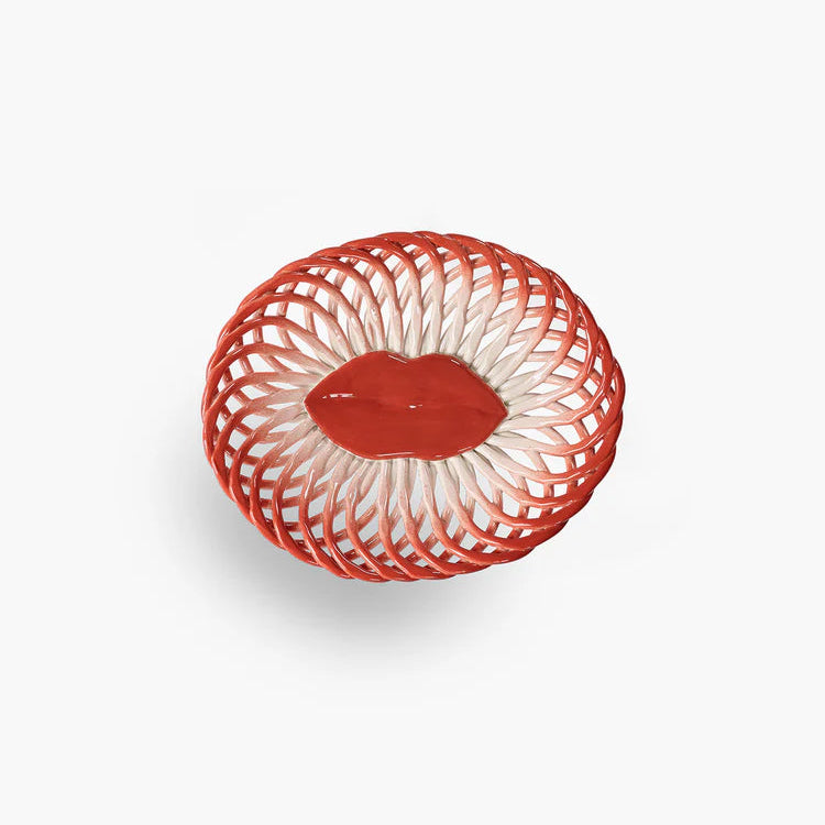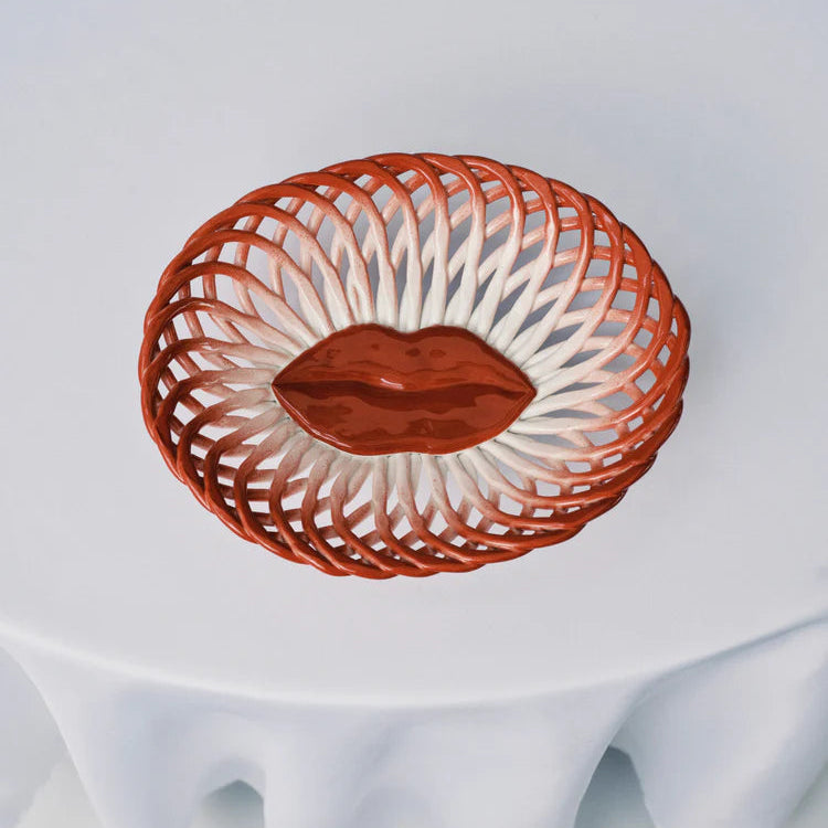 Deze aardewerken broodmand van Wouters & Hendrix combineert kunst en humor met alledaagse elegantie. De Salvador-mand is handgemaakt met een geweven textuur en aan de onderkant voorzien van gebeeldhouwde lippen, een speelse knipoog naar Salvador Dalí.