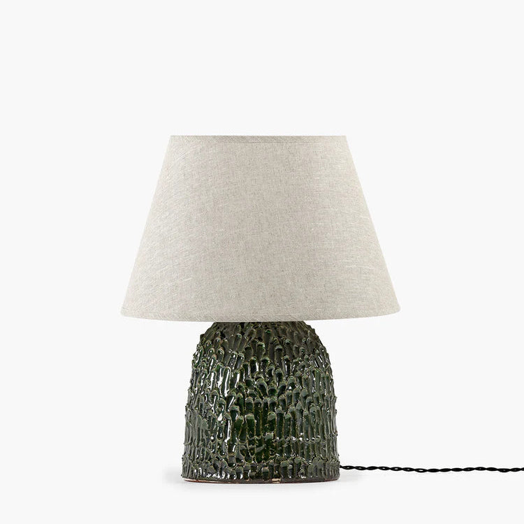 De Tronco tafellamp van Sylvain Willenz combineert een keramische voet, geïnspireerd op een boomstam, met een zachte, stralende kap.