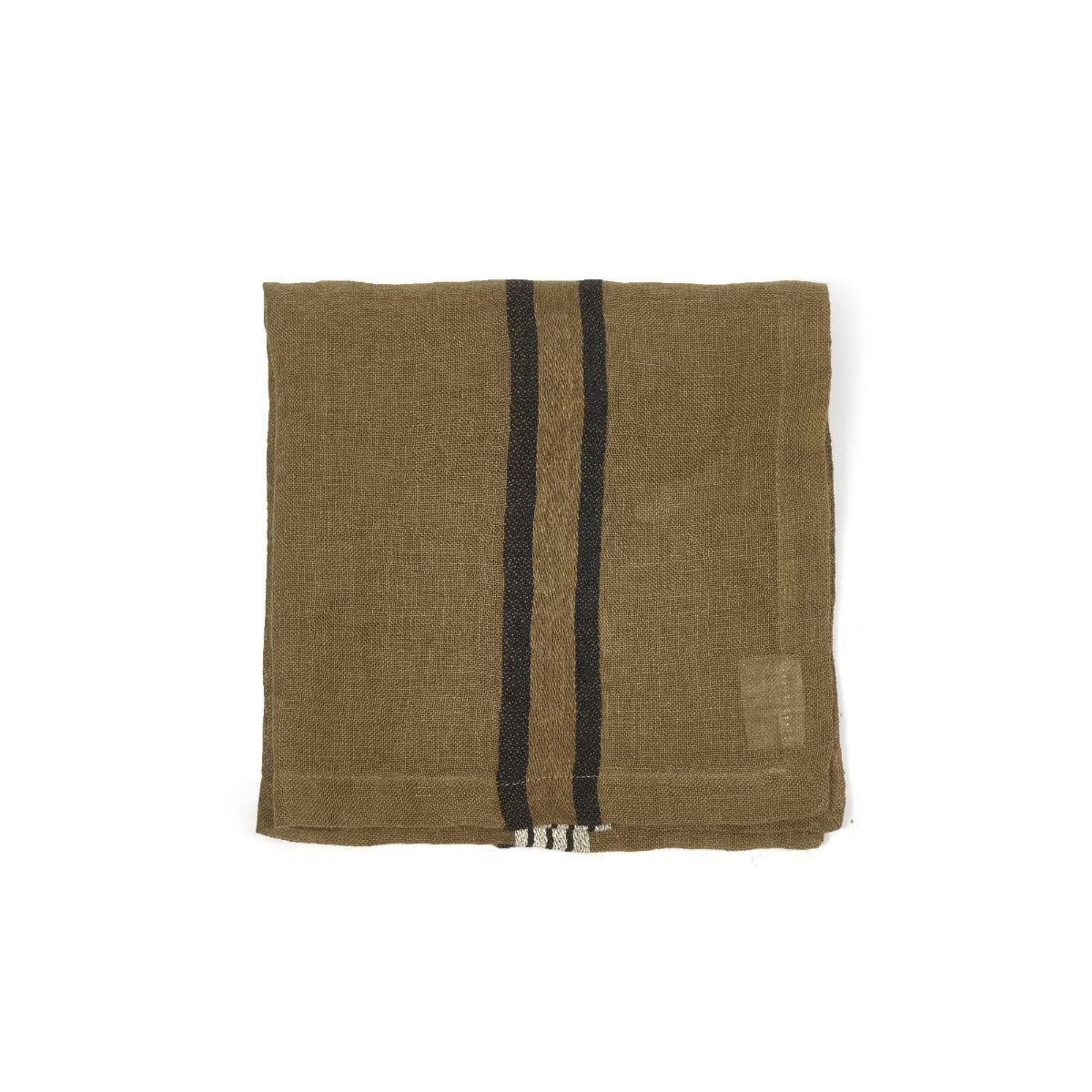 De servet heeft een gemberkleurige achtergrond met een ivoorkleurige en zwarte streep aan het éne uiteinde en een zwarte en gemberkleurige streep aan het andere uiteinde.