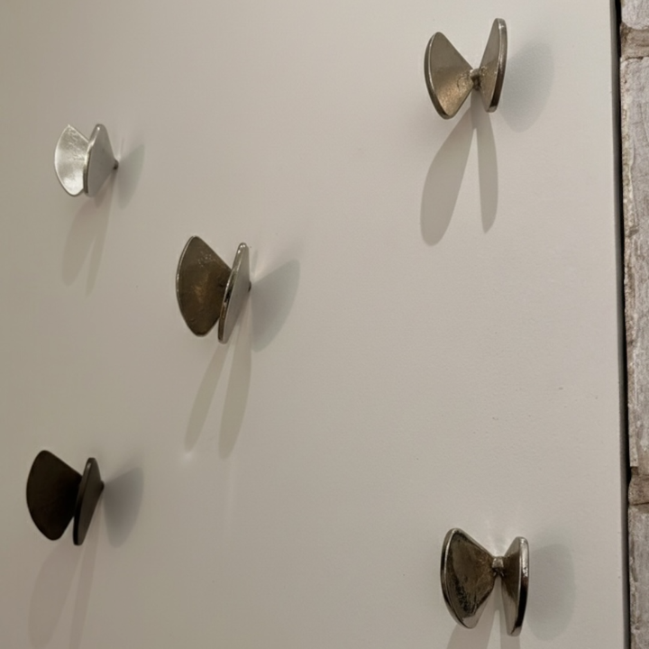 Hangende vlinders in messing gietwerk in twee verschillende formaten. De vlinders zijn verkrijgbaar in twee maten en kunnen vrij worden geordend op de muur. Materiaal: gemengde afwerkingenLevering: op voorraad Afmetingen: Klein: L 5 cm × B 4 cm × H 5 cm Groot: L 8 cm × B 6 cm...