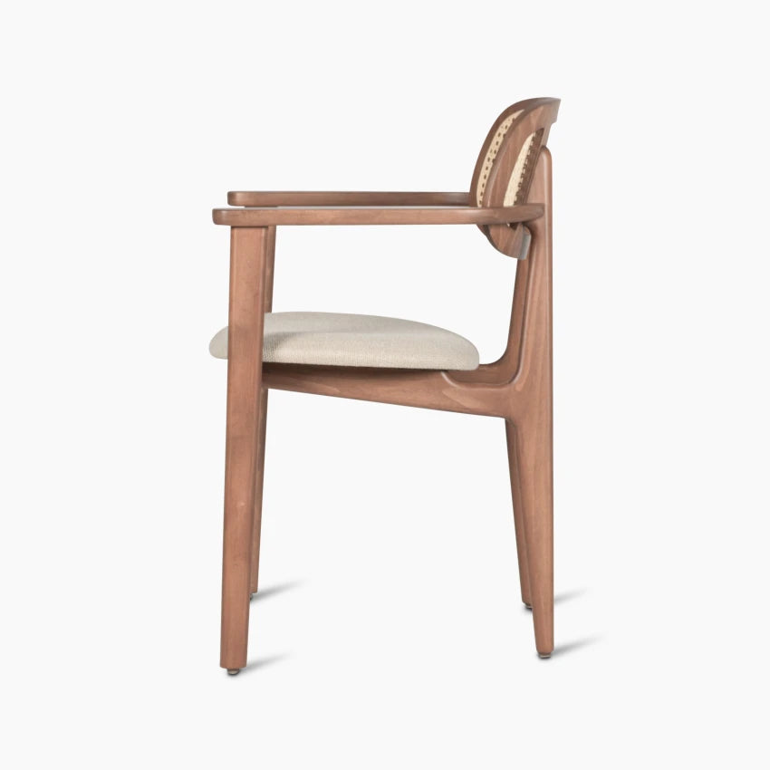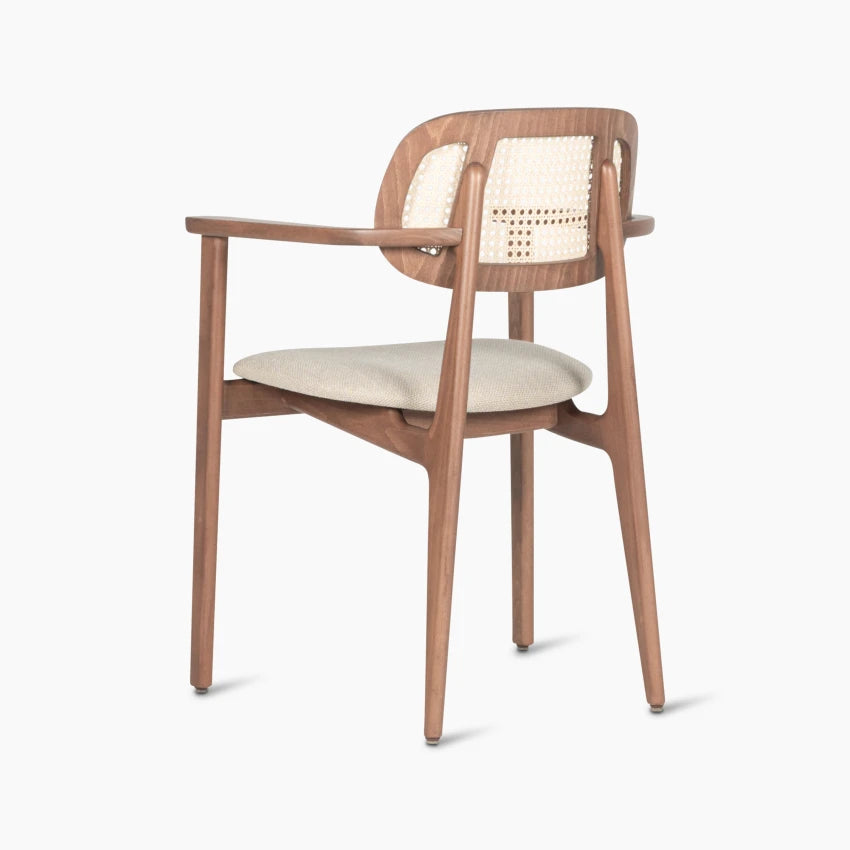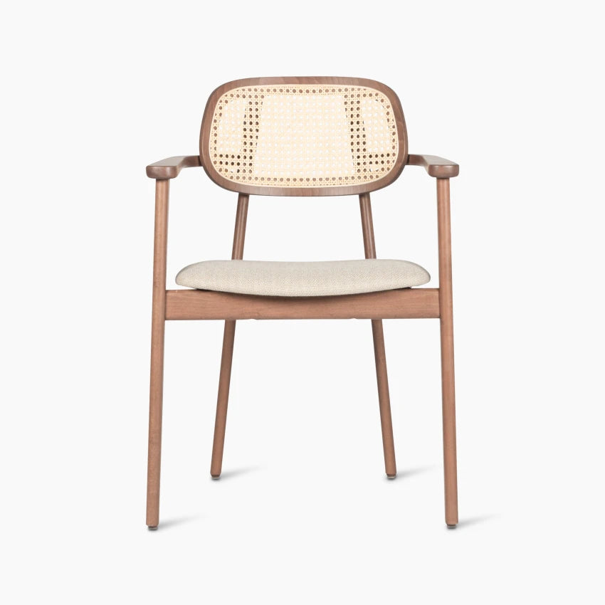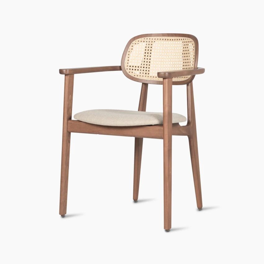 Een verfijnde eetkamerstoel met prachtig geweven canage en een houten frame.